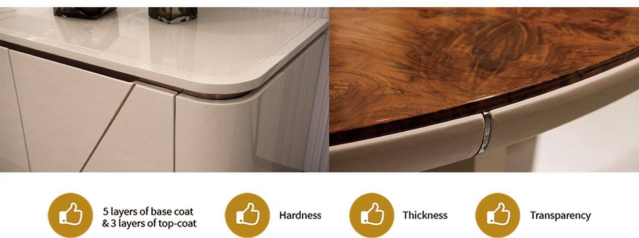 SANHE paint products have undergone an 8-layer paint process: 5 layers of base coat and 3 layers of top-coat. The paint master with more than 20 years' experience in the industry strictly controls the blending ratio of PE paint, CoNap and MEKP, and repeatedly paints, burnishes and polishes by hand until the paint reaches the EU hardness standard of 2H+ and thickness standard of 1.2+M, and the veneer texture is guaranteed clear and distinct. At present, the paint process in domestic furniture factories generally only has 3 layers (2 base and 1 top), while there are 4 layers (2 base and 2 top) for better quality. The paint process of SANHE products has been far ahead of the entire industry.